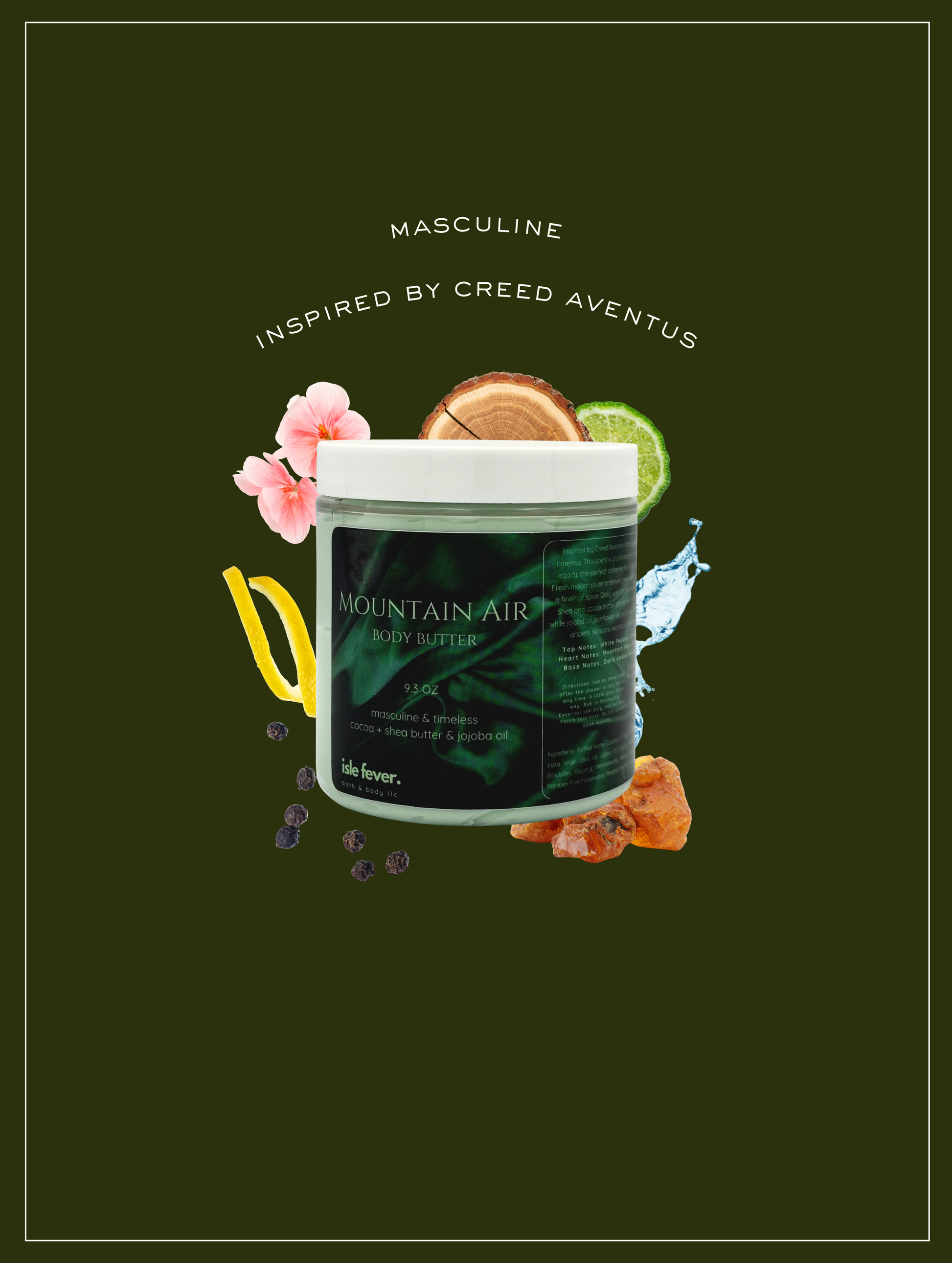 Inspired by Creed Aventus. Masculine, captivating, and timeless. This scent is a celebration of power, success, and legacy, the perfect statement piece to complete any look. Fresh mountain air and evergreens with flowing streams and a finish of spice.